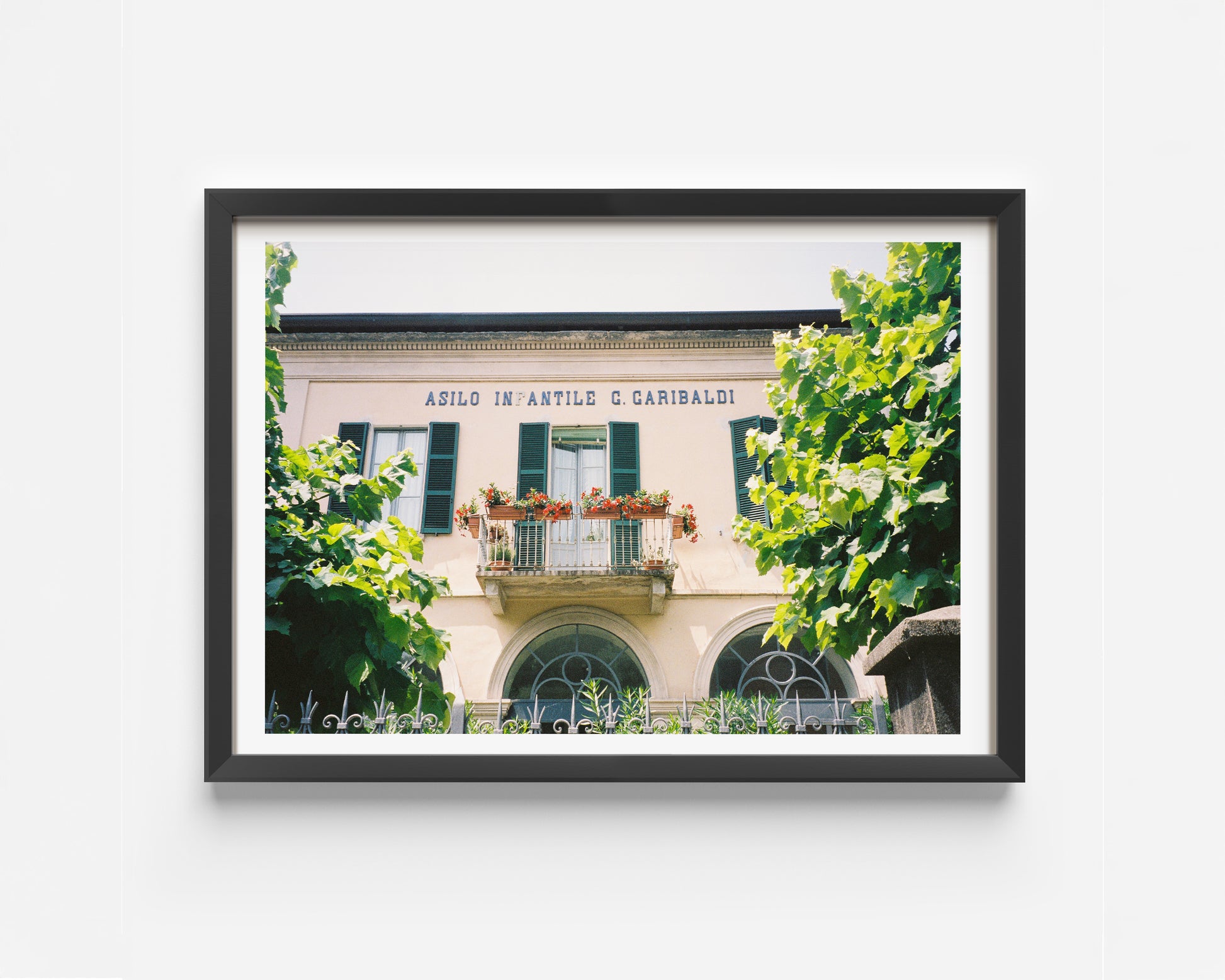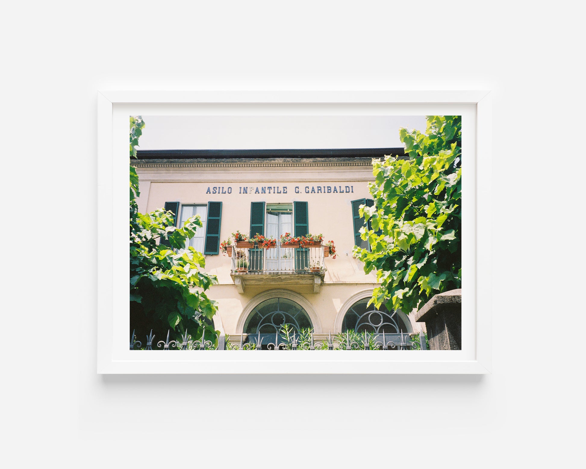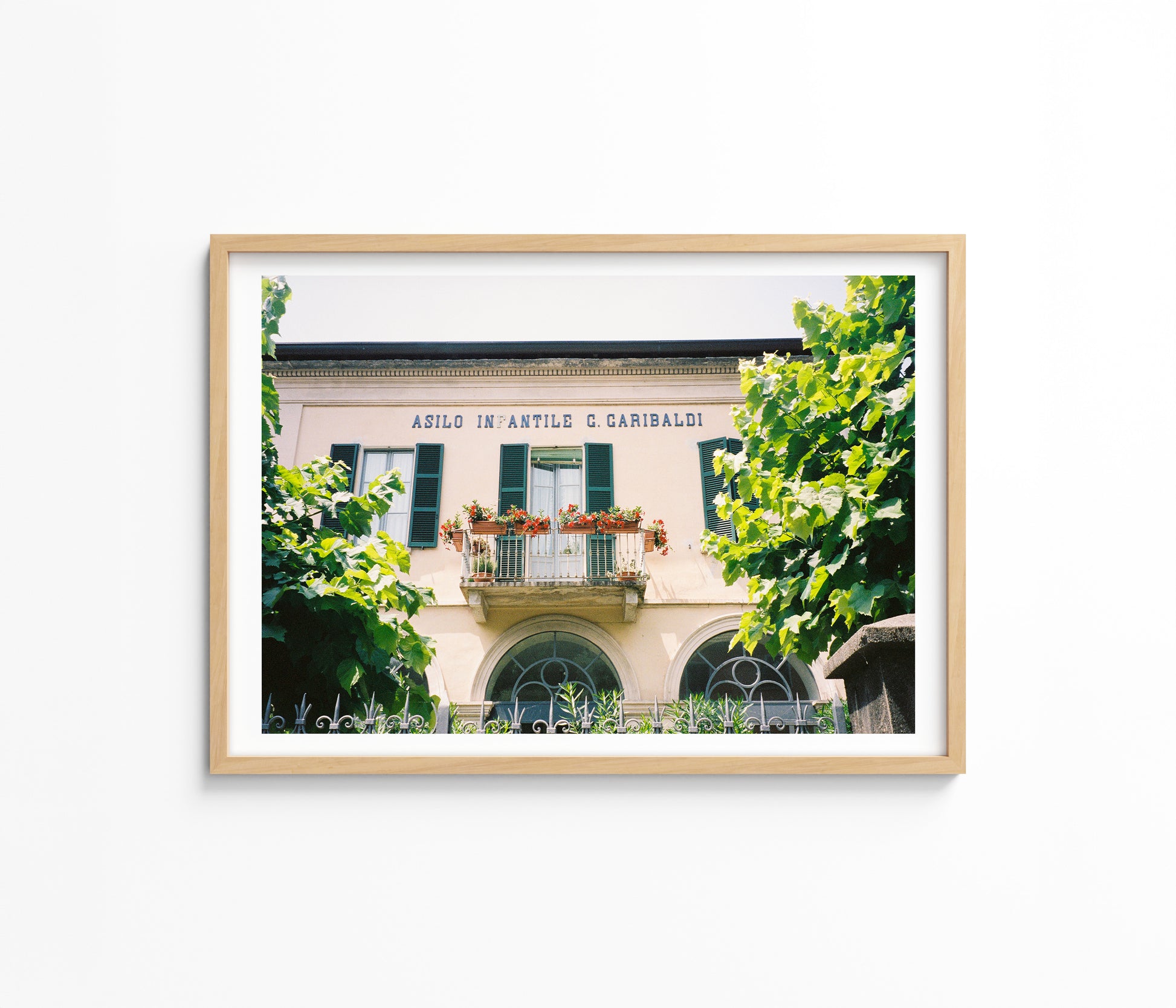 Dappled sunlight filters through lush greenery, framing the charming facade of Asilo Infantile G. Garibaldi. Shuttered windows open onto a balcony adorned with vibrant red geraniums, a quiet yet quintessentially Italian scene. A glimpse of everyday beauty, where history and nature intertwine effortlessly.
