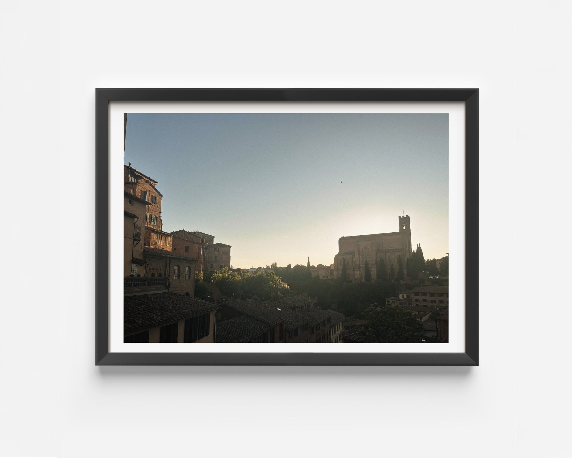 As the sun dips behind the rolling hills of Siena, the city is bathed in a warm, golden glow. The silhouette of Basilica di San Domenico stands tall against the evening sky, its presence timeless and serene. A quiet moment in Tuscany, where history meets the soft embrace of dusk.