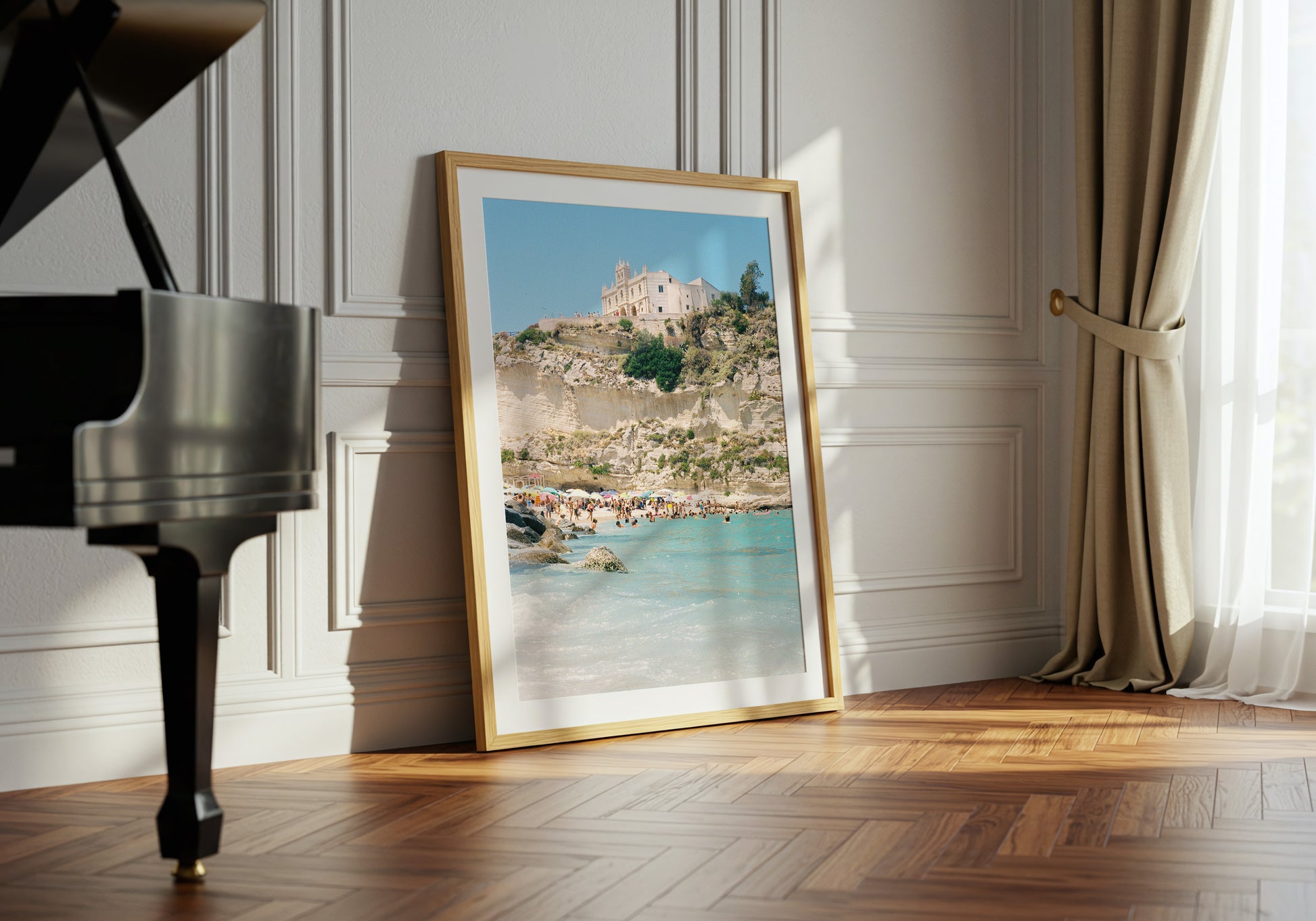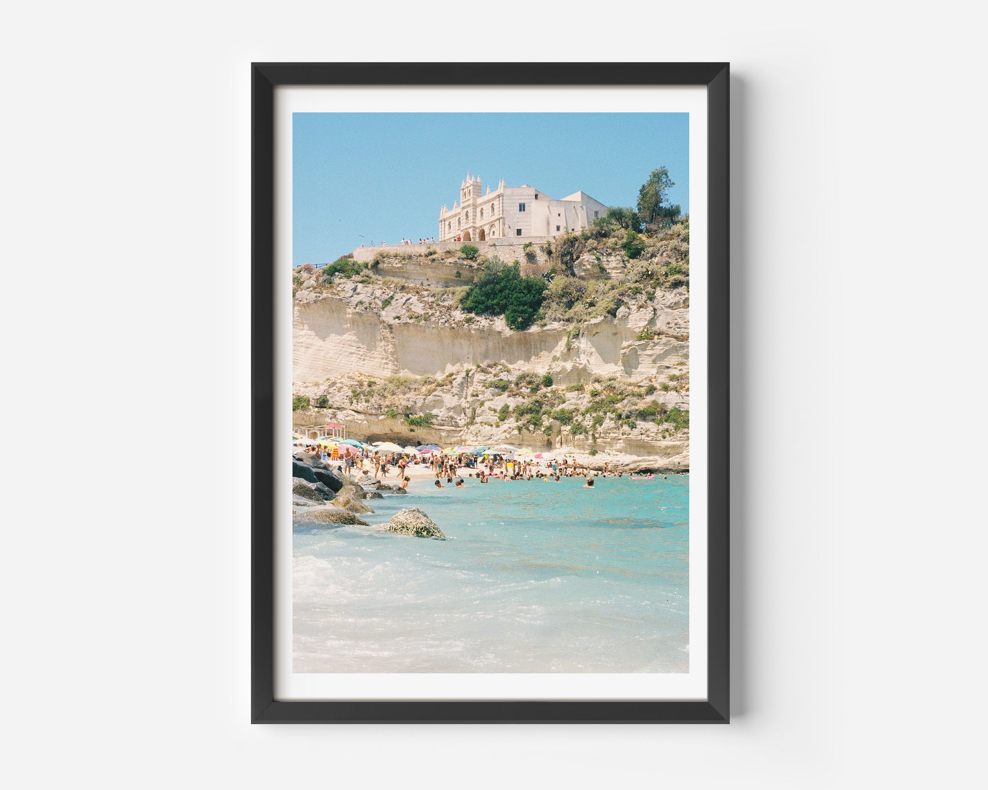 Framed by dramatic limestone cliffs and crowned by the historic Santa Maria dell’Isola, Spiaggia di Tropea is a vision of southern Italian summer. The turquoise waters shimmer under the midday sun as beachgoers find shade beneath colorful umbrellas, embodying the effortless charm of la dolce vita.