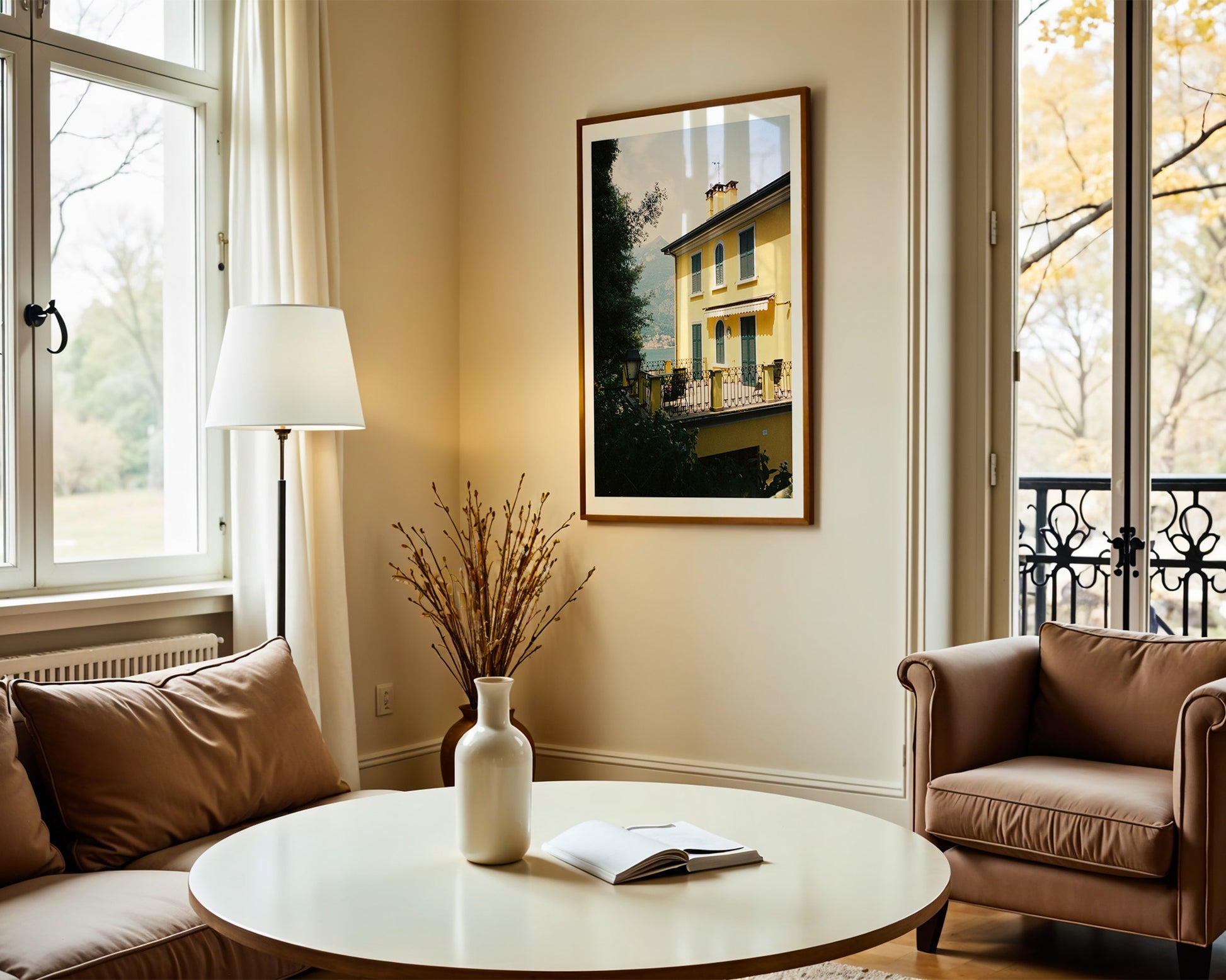 Bathed in golden light, Villa Monastero overlooks the shimmering waters of Lake Como, its ochre walls and green shutters embodying the timeless elegance of northern Italy. A quiet terrace, framed by wrought iron and lush greenery, invites slow mornings and endless views of the distant mountains. A scene of pure Italian tranquility.